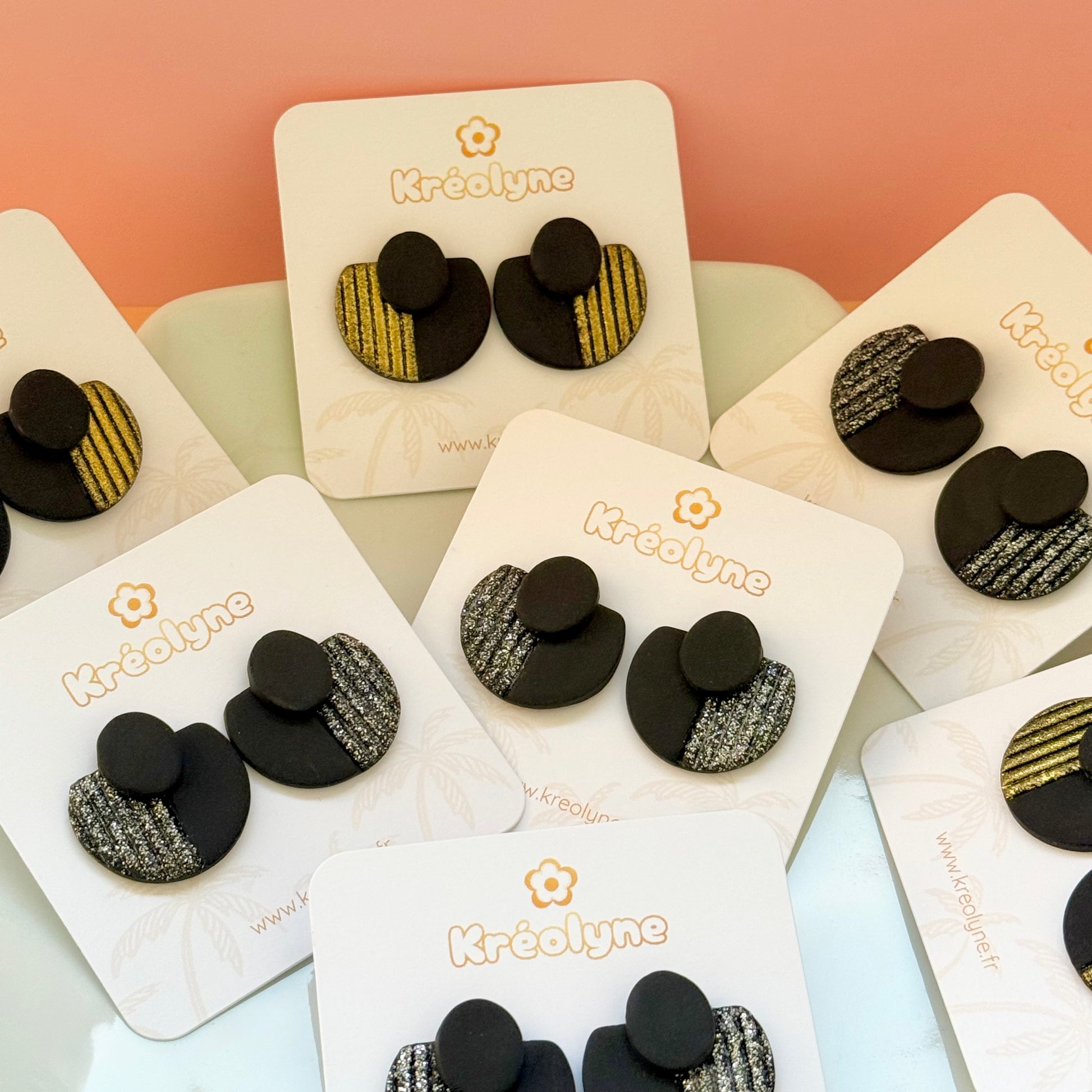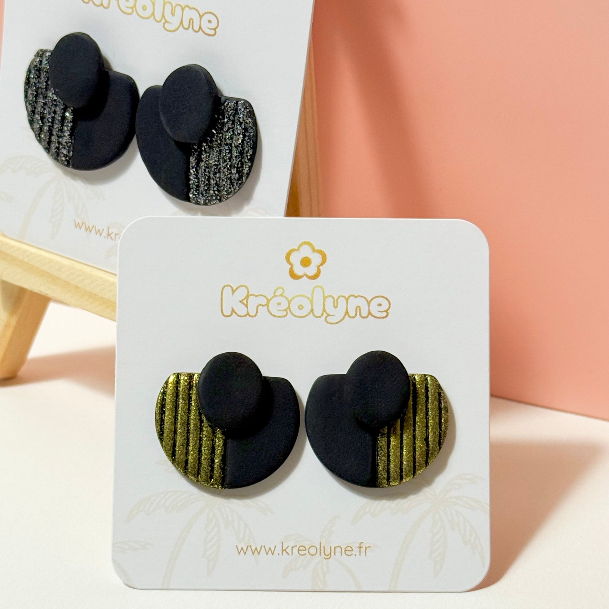 Les boucles d’oreilles Marilyn sont réalisées à la main en argile polymère, avec des paillettes disponibles en argenté ou doré.