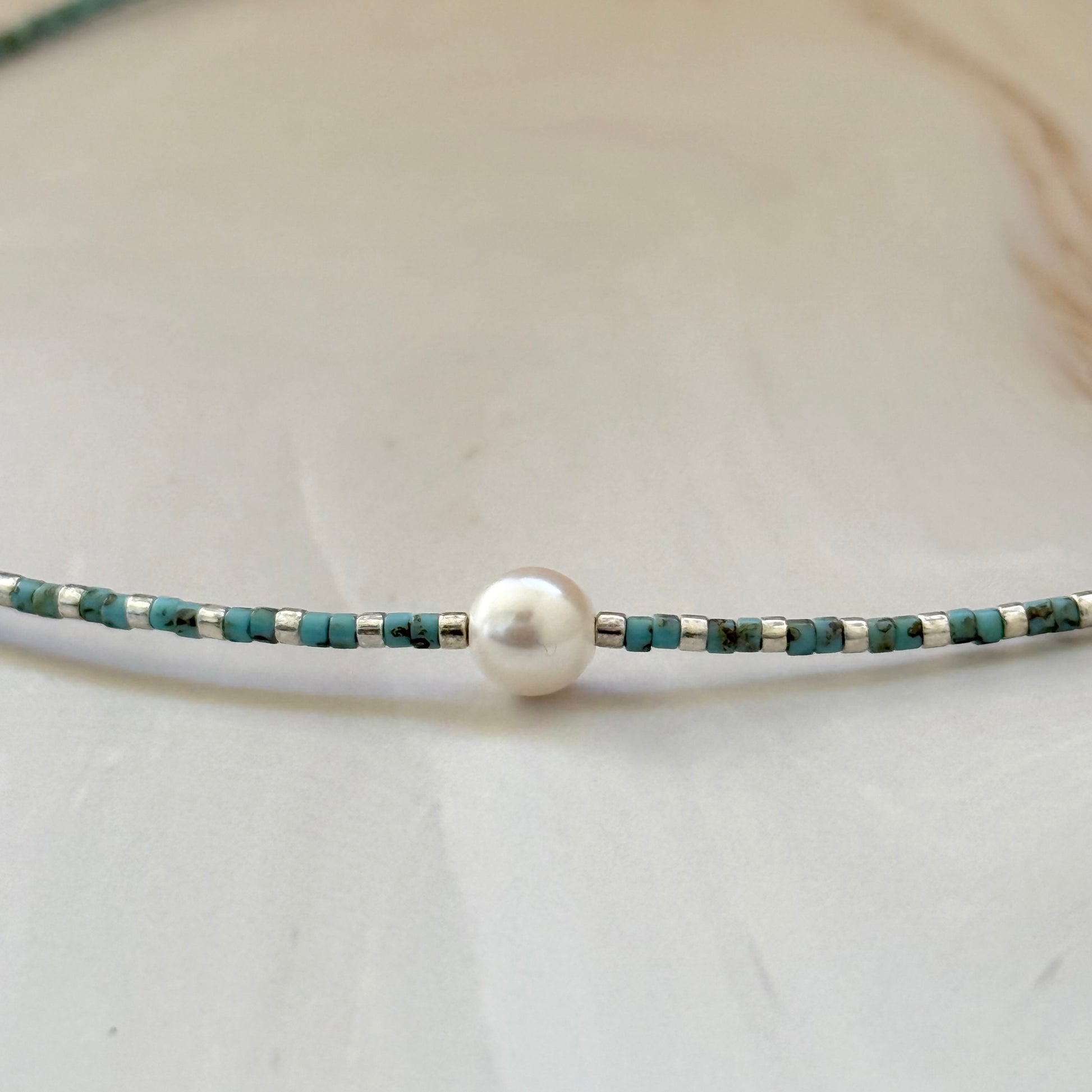 Ce collier délicat est composé de perles japonaises Miyuki de haute qualité, dans des tons inspirés de la turquoise africaine (bleu, vert), associées à une perle centrale imitation d’eau douce à l’éclat nacré.