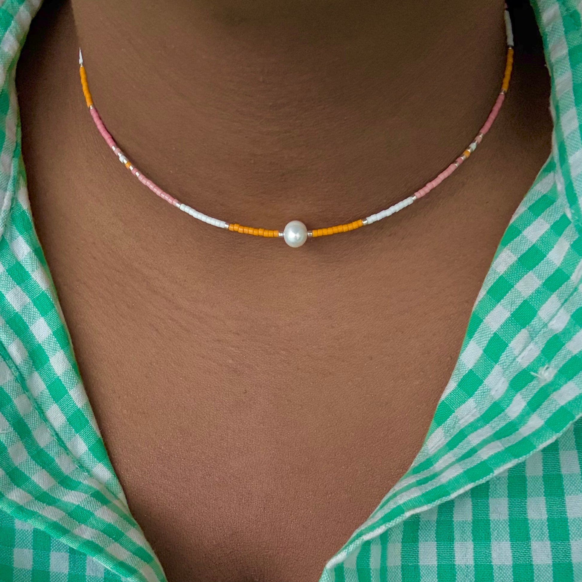 Un collier raffiné mêlant perles Miyuki aux tons orange, rose, argenté et blanc, sublimé par une perle d’eau douce naturelle. Un bijou lumineux et délicat, symbole de pureté et d’élégance intemporelle.