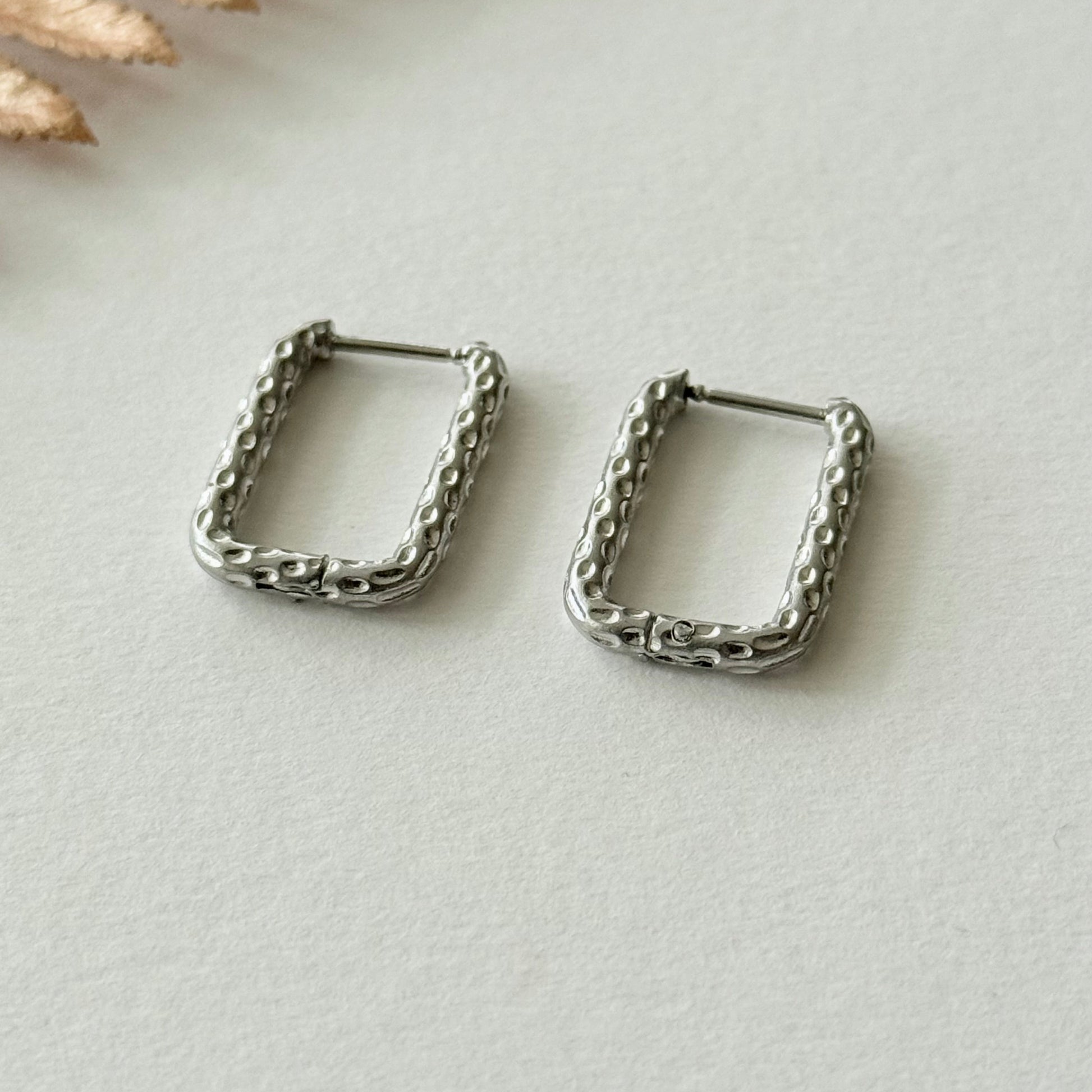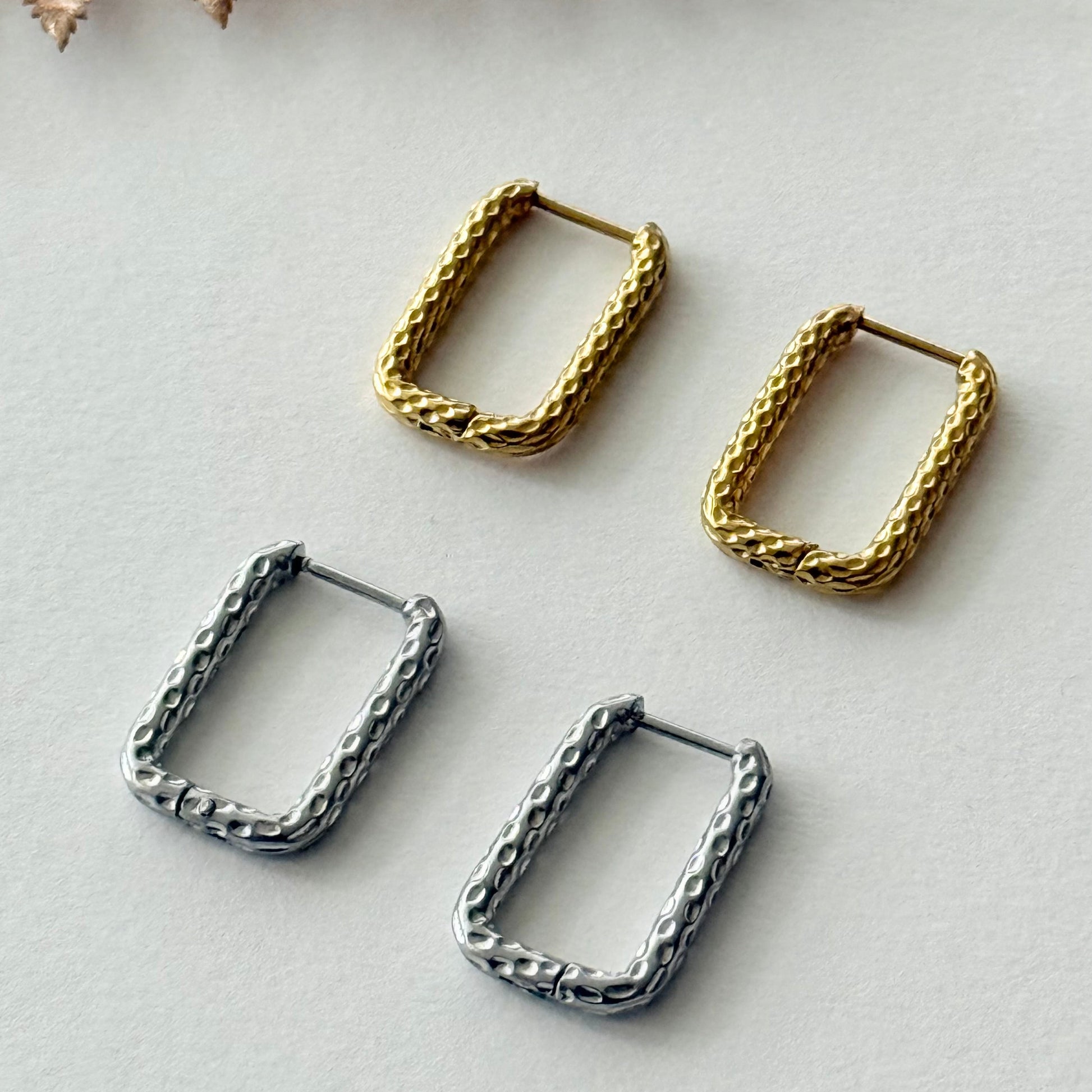 Les créoles Oshun sont fabriquées en acier inoxydable, garantissant une excellente résistance à la corrosion et à l’oxydation pour un usage durable. Leur forme rectangulaire martelée, réalisée à la main, apporte une texture unique et élégante.