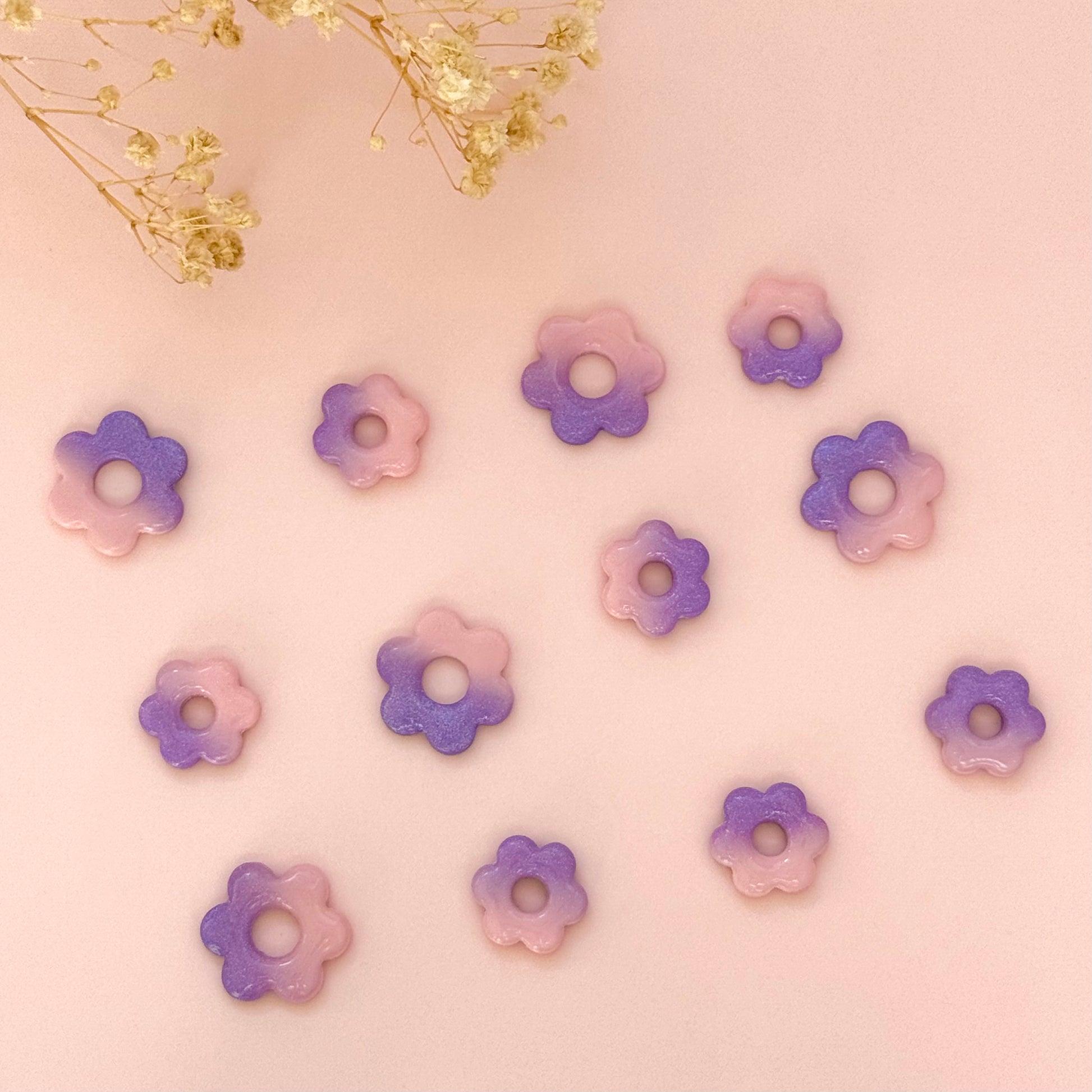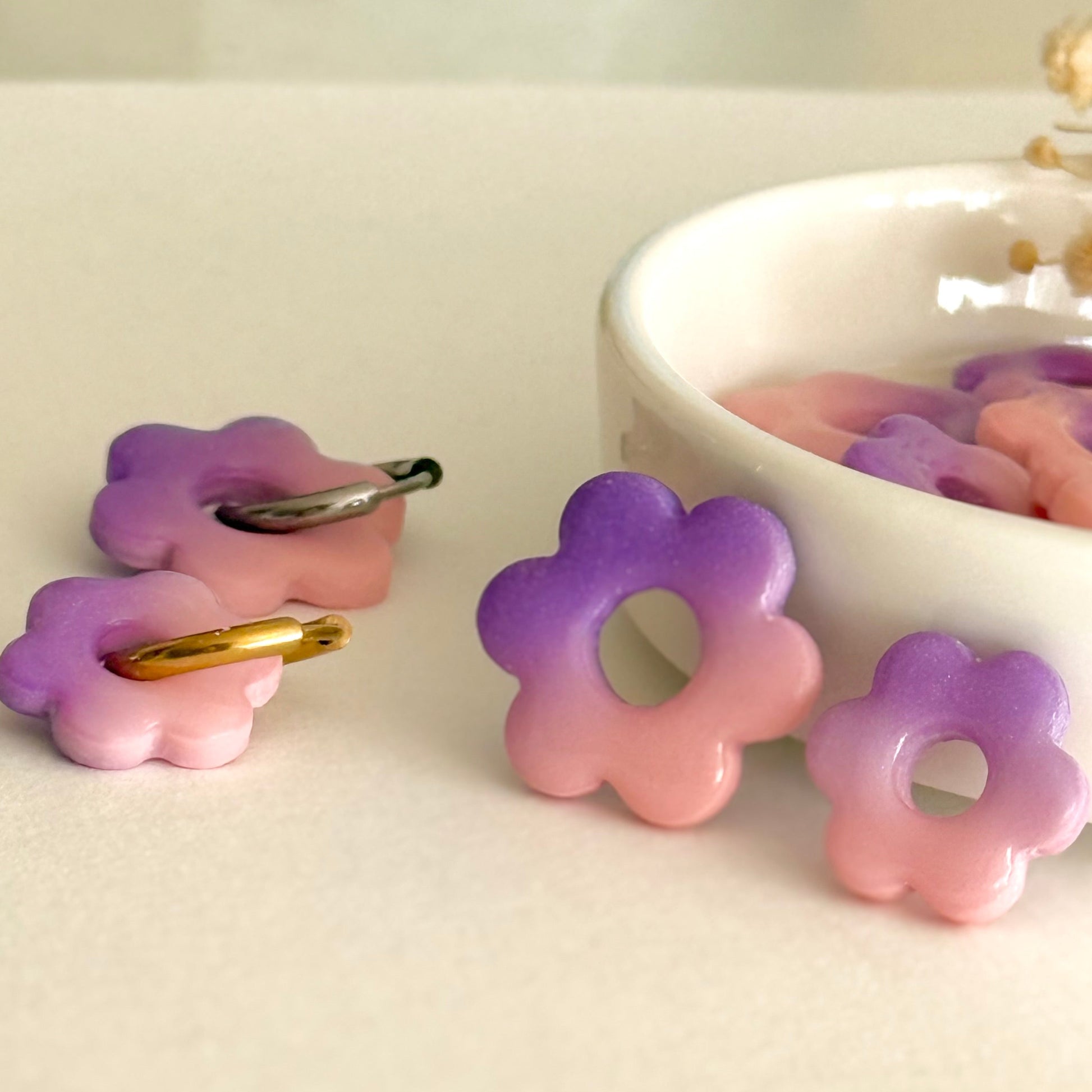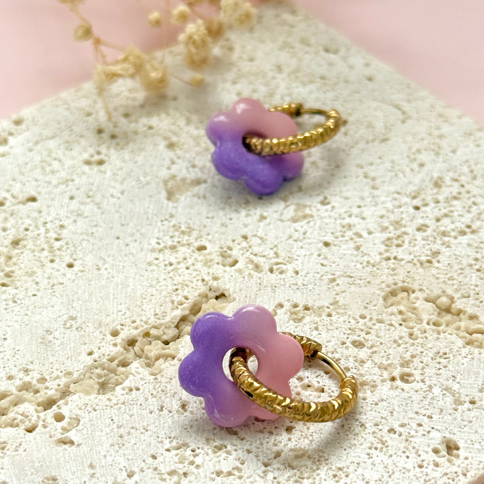 Les pampilles Arielle, imaginées pour s’accorder aux créoles interchangeables, révèlent des nuances douces de rose et de violet, subtilement pailletées.